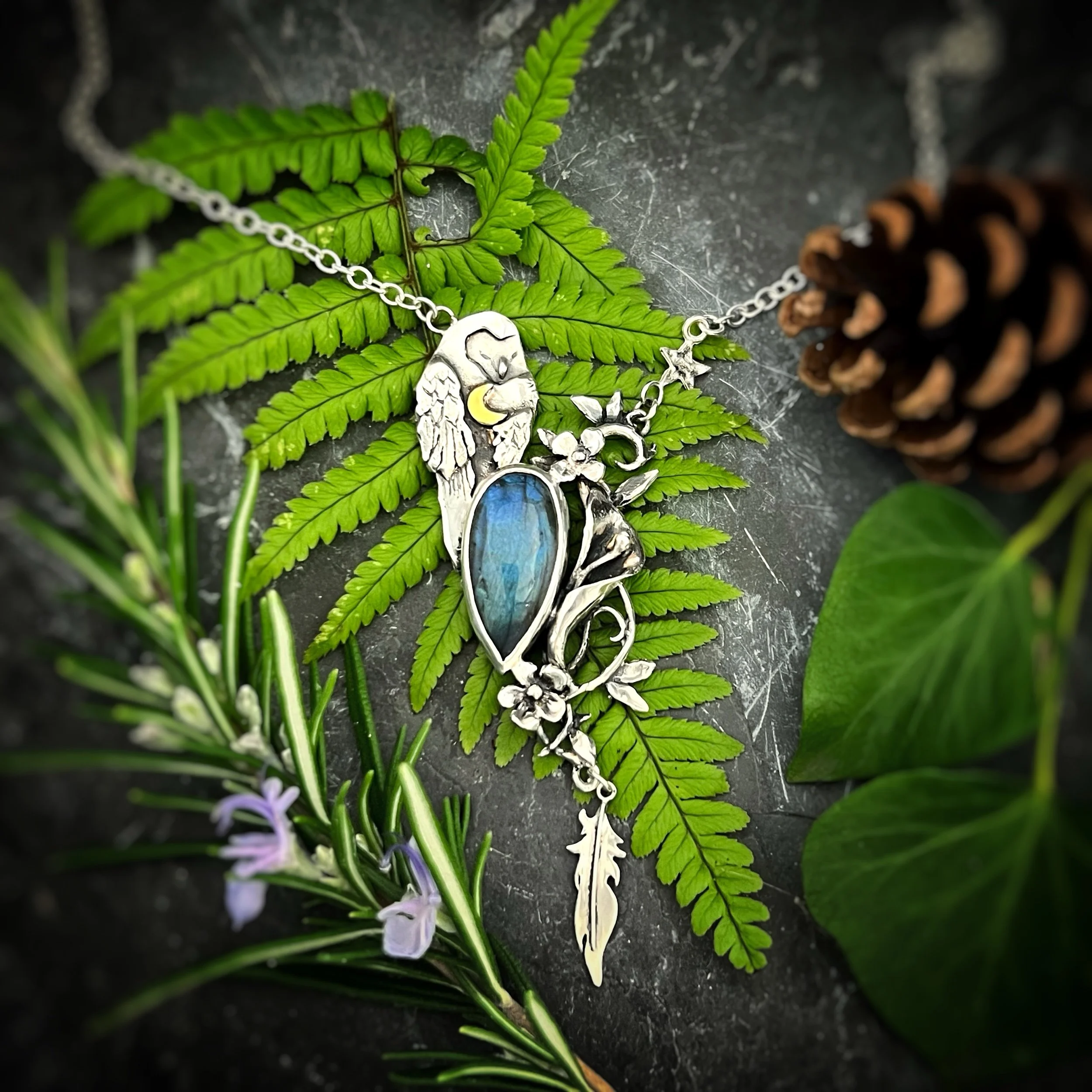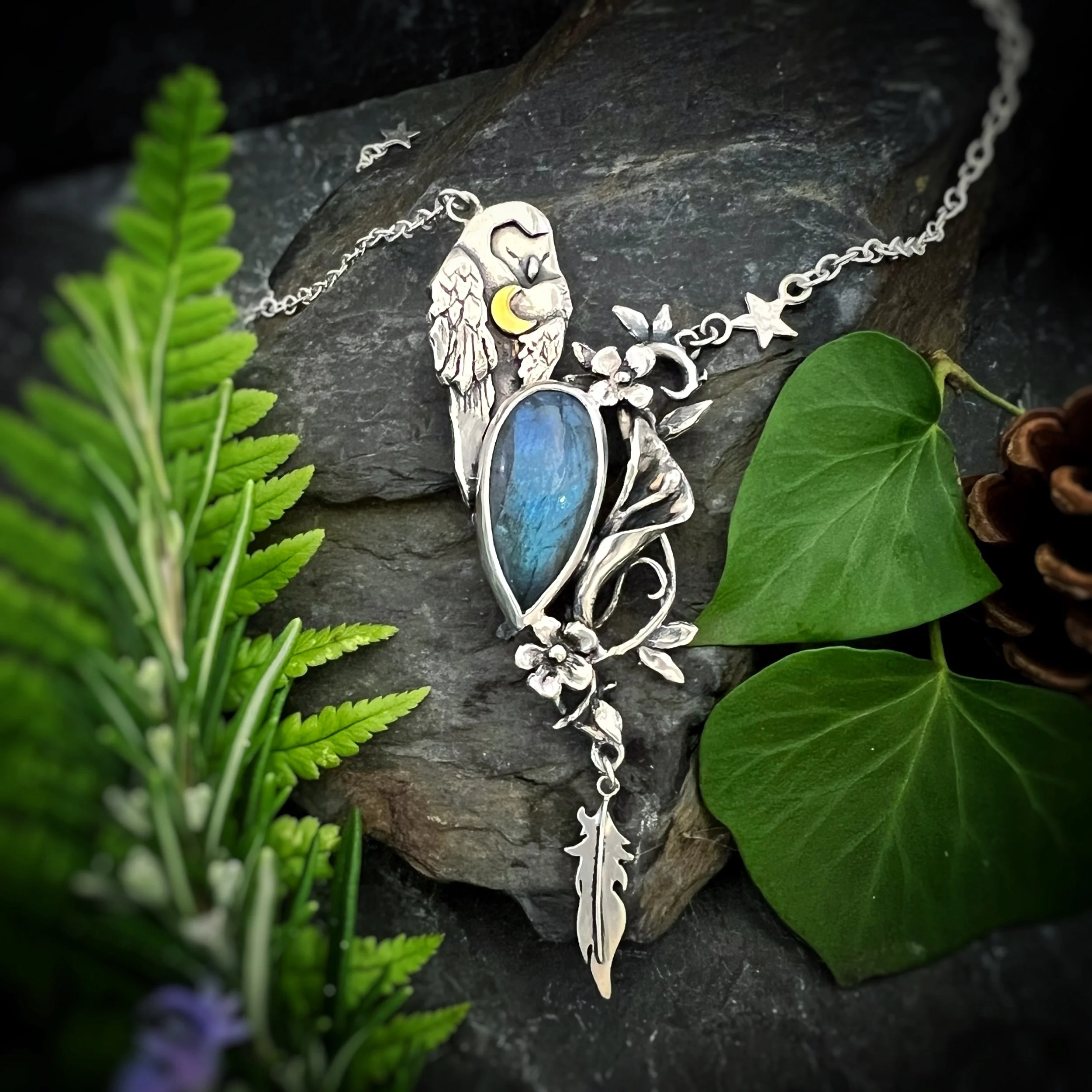 Strix is solid sterling silver with labradorite and an 18ct gold plated moon. She is approx mm long and hangs on a star studded 22” chain.