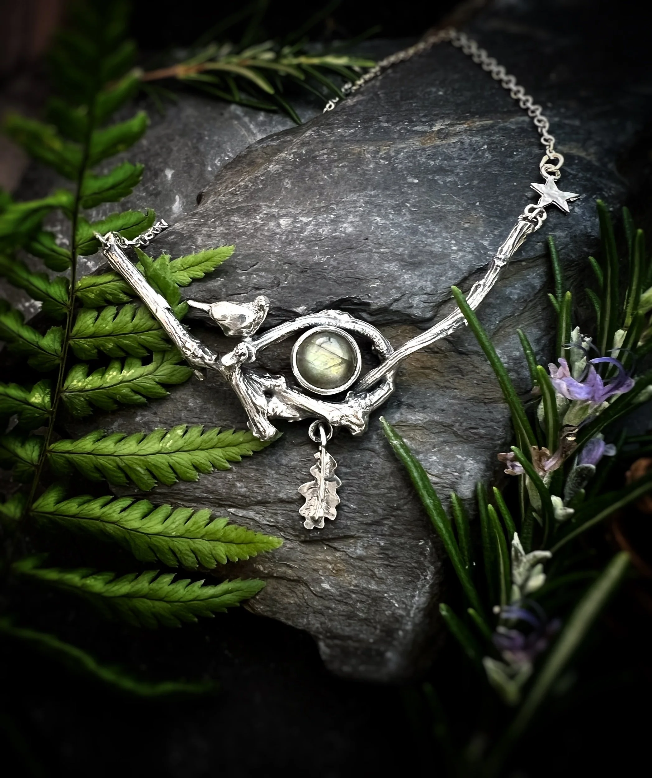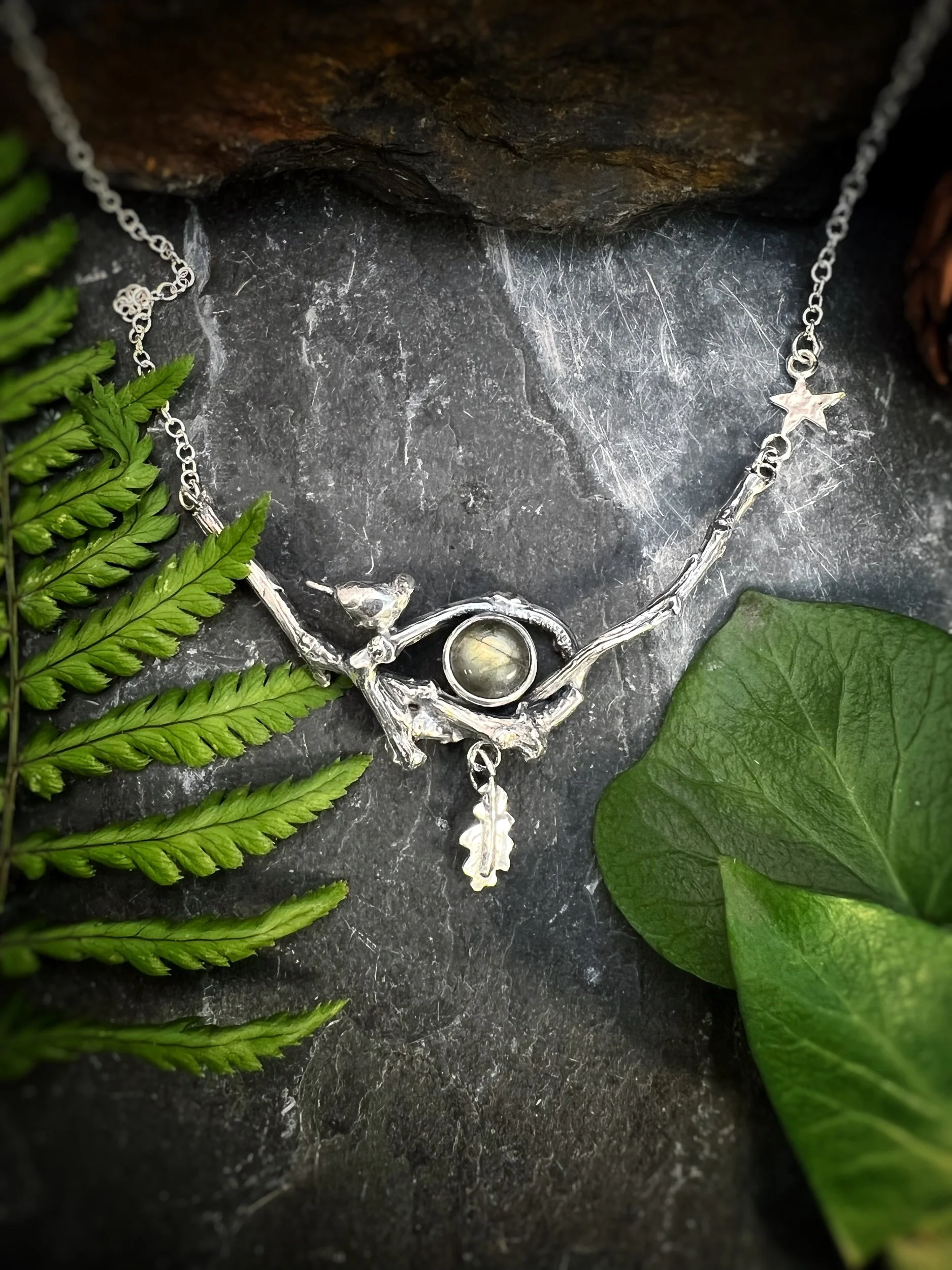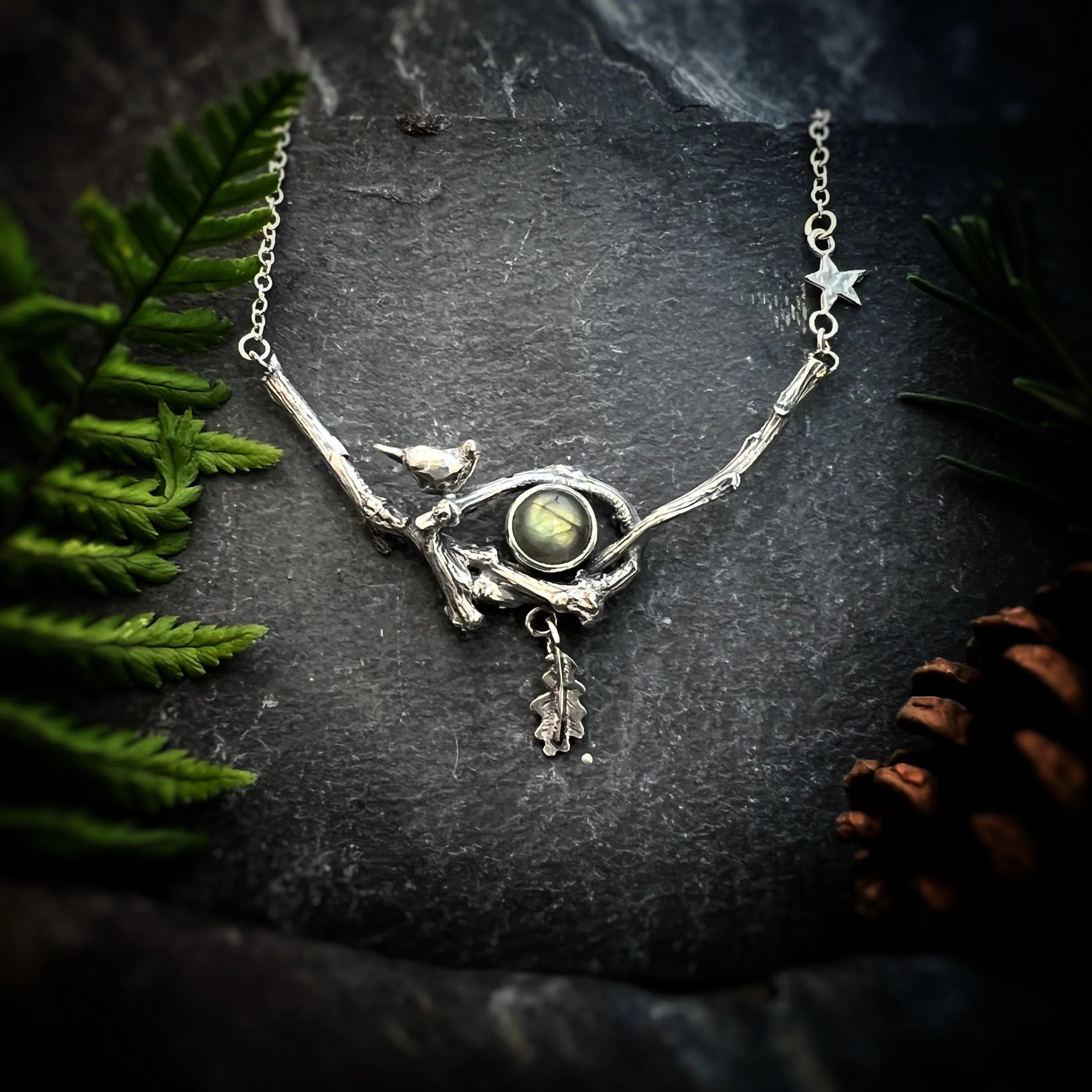A little bird, hand modelled and cast in silver, joined us and we added a tiny oak leaf to the bottom of the necklace.
