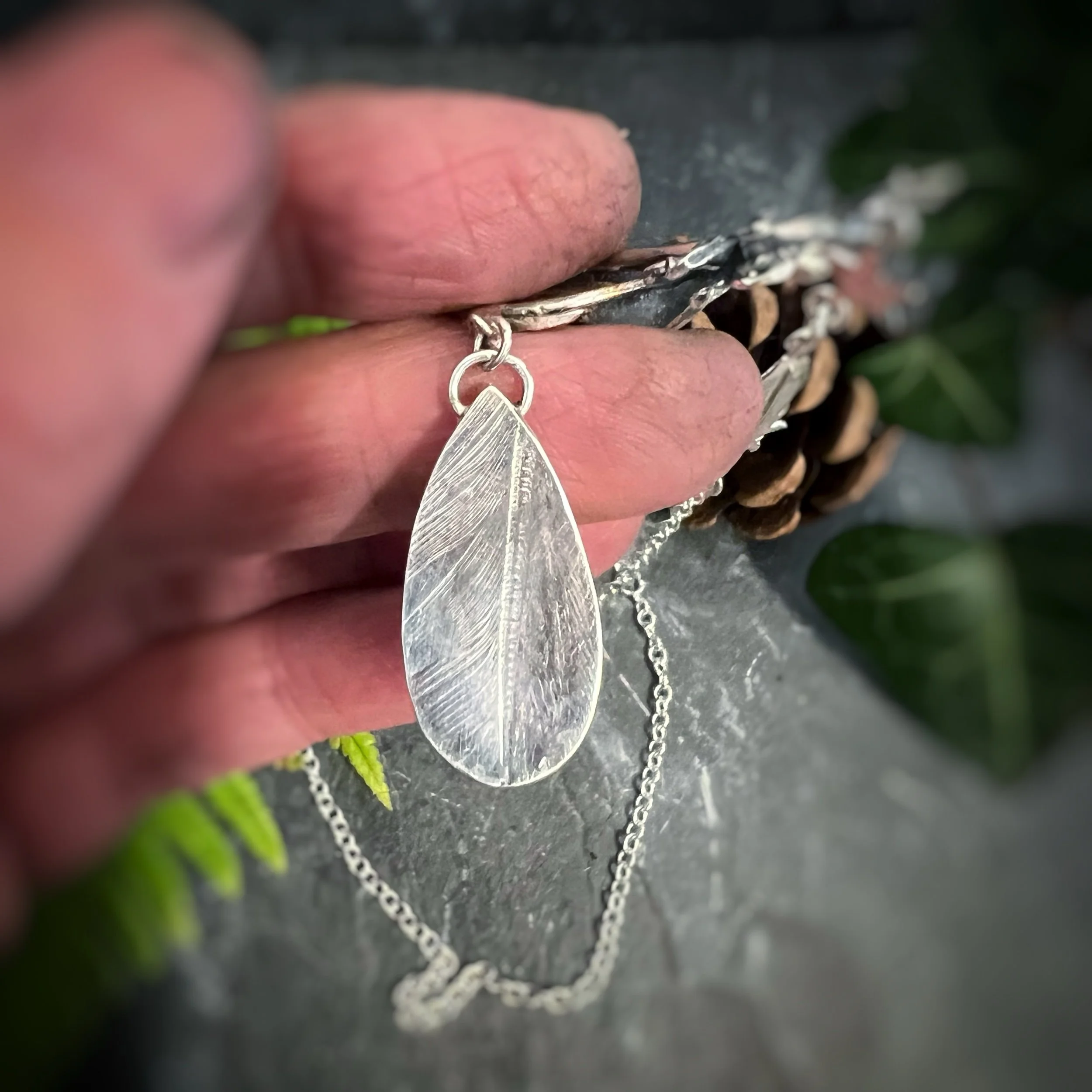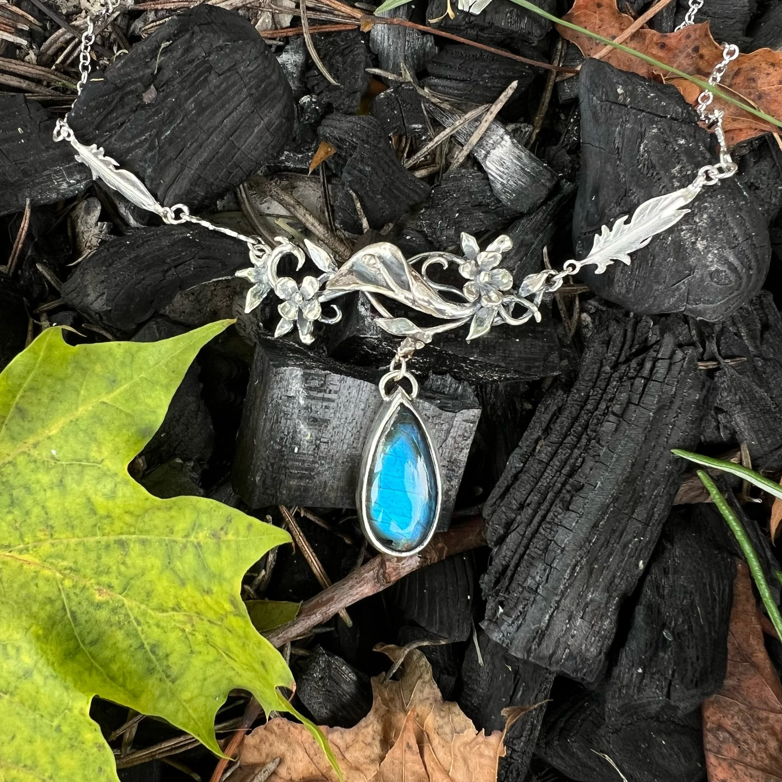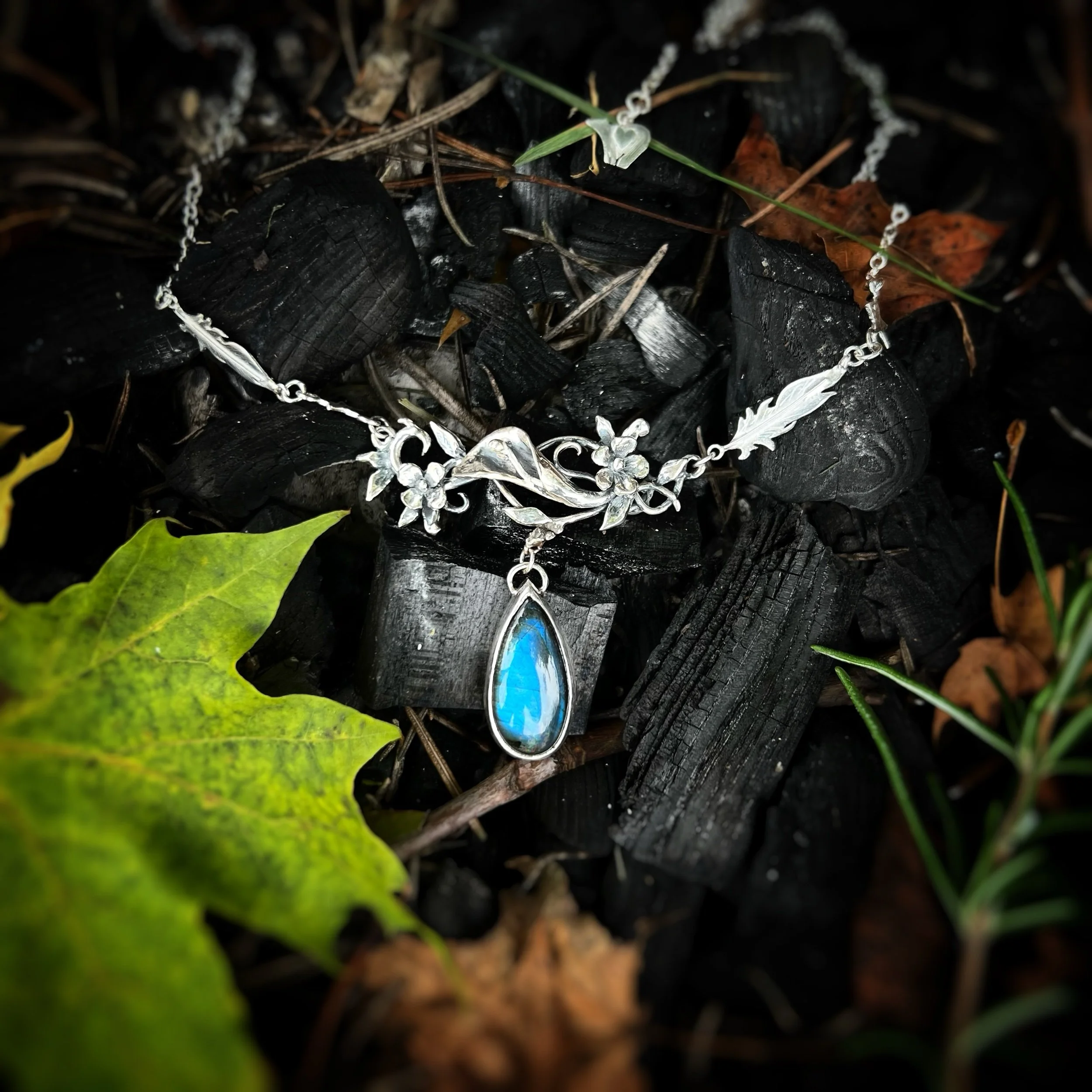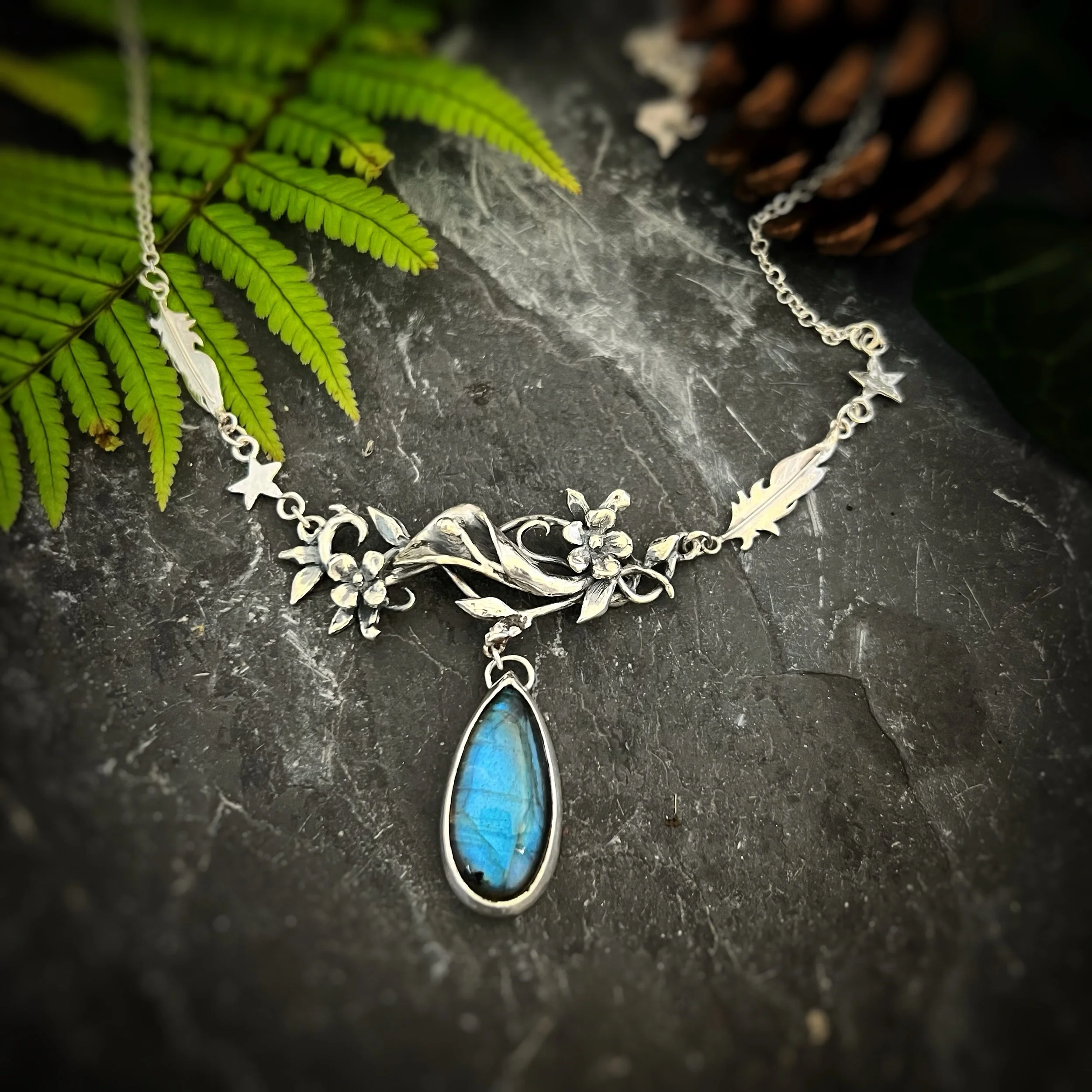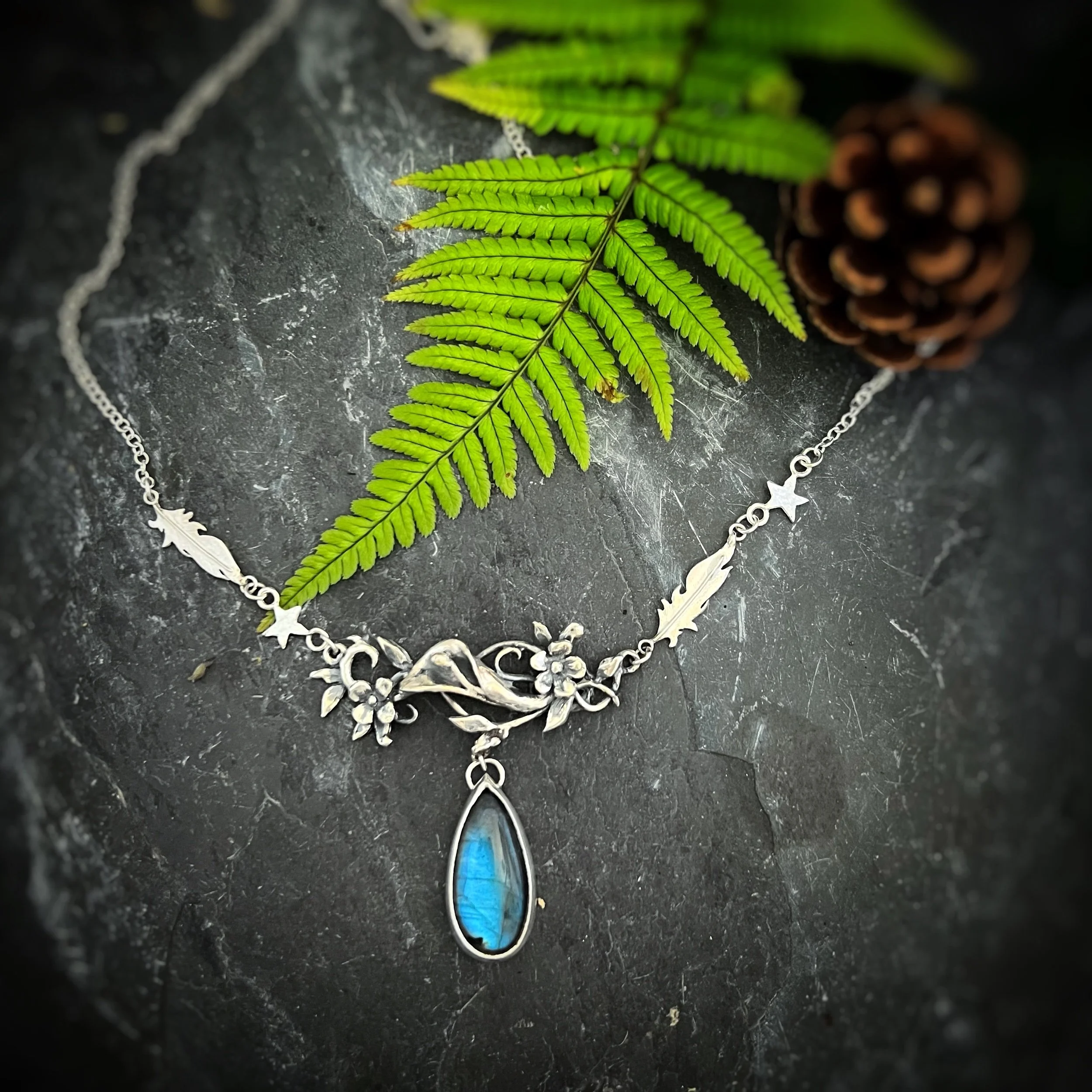 Labradorite tear drop approx 30mm long set into a feathery, starry 10- 20” chain.