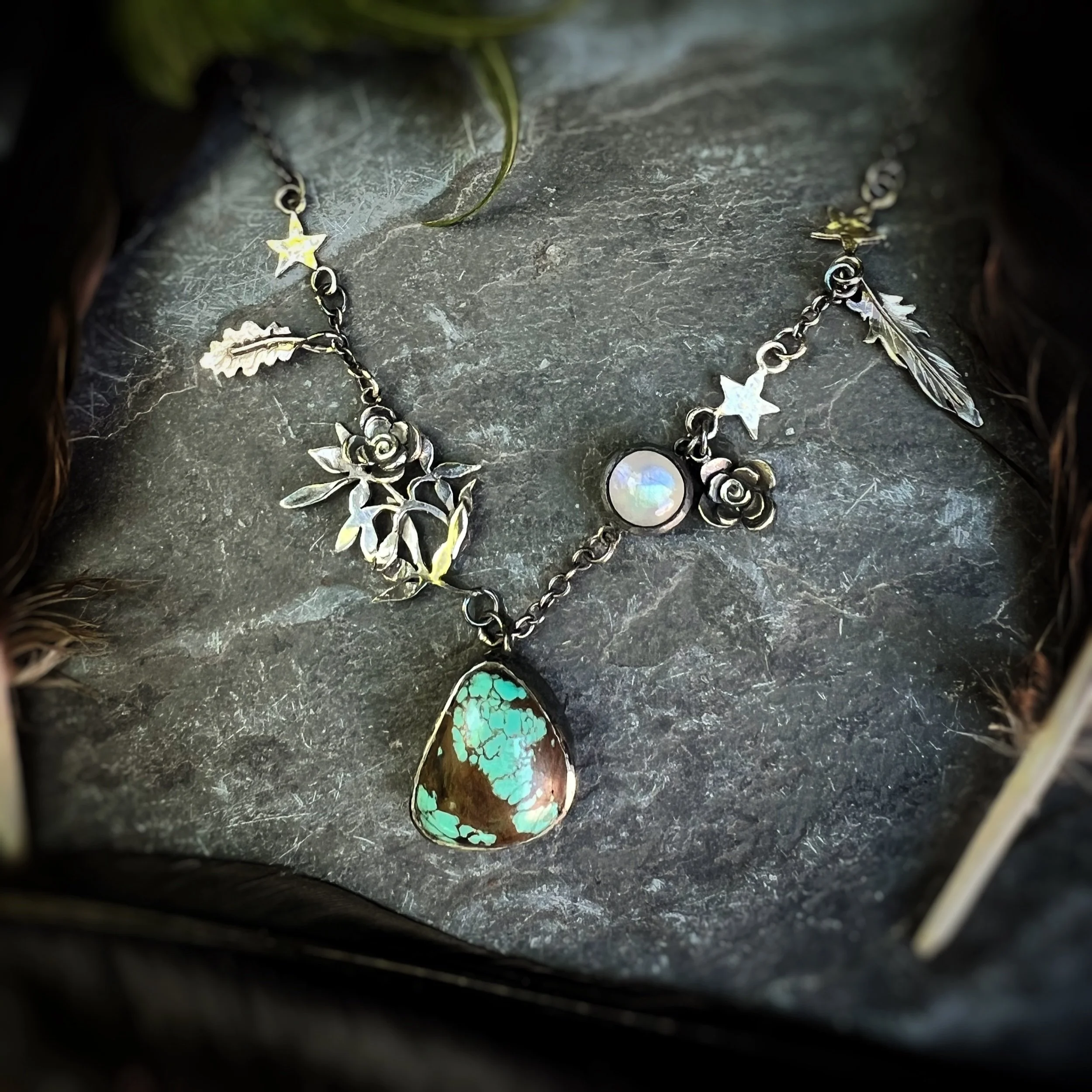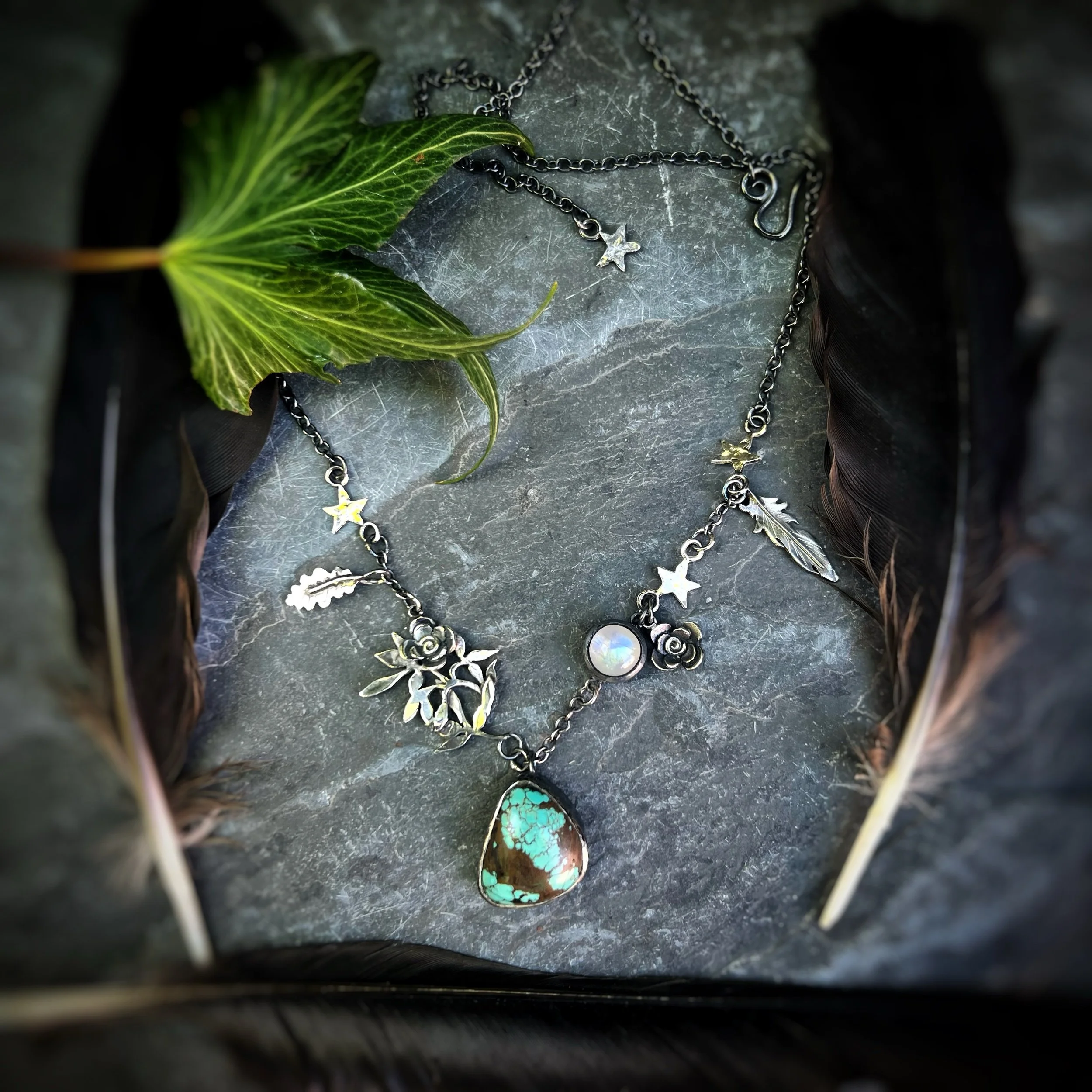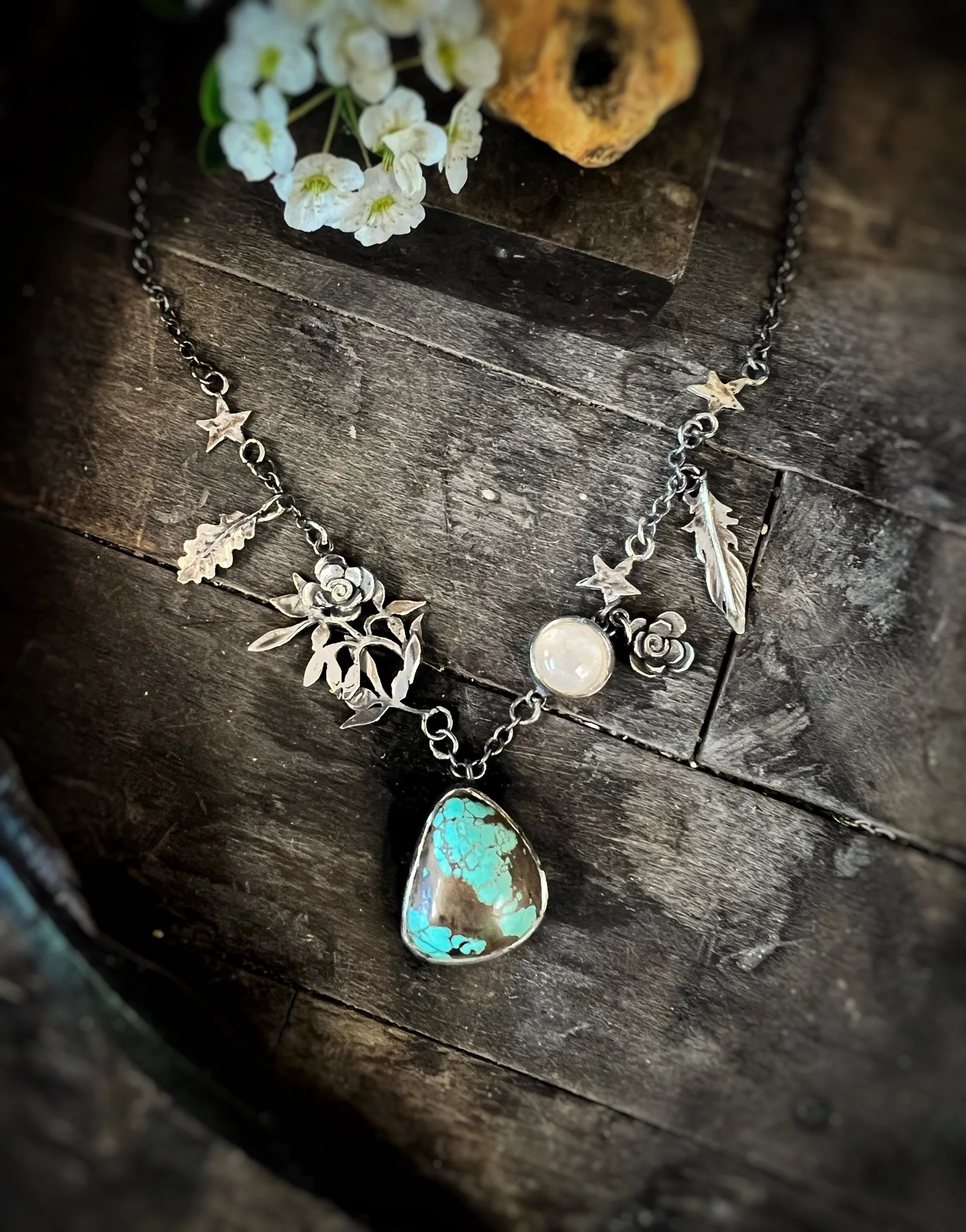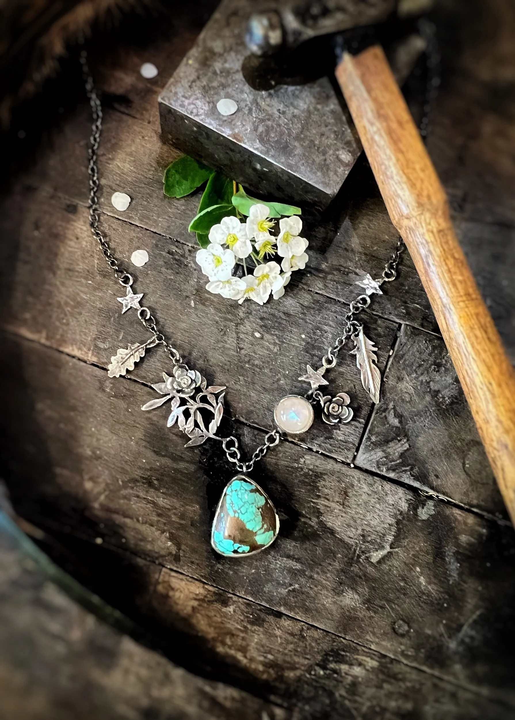 ‘An Talamh’ is solid sterling silver, turquoise and moonstone with a little gold moon on the back of the setting. She is strung on a 20” oxidised chain.
