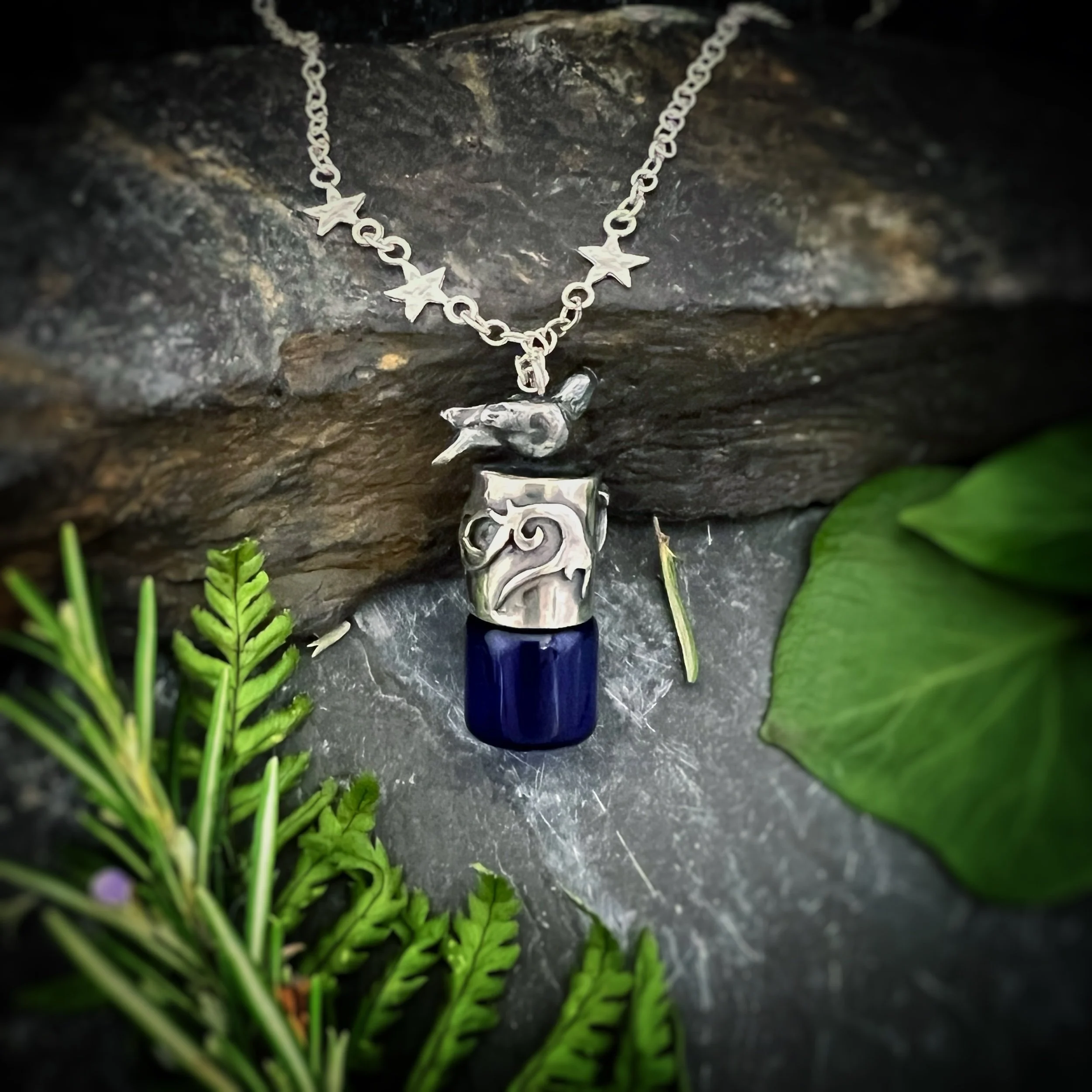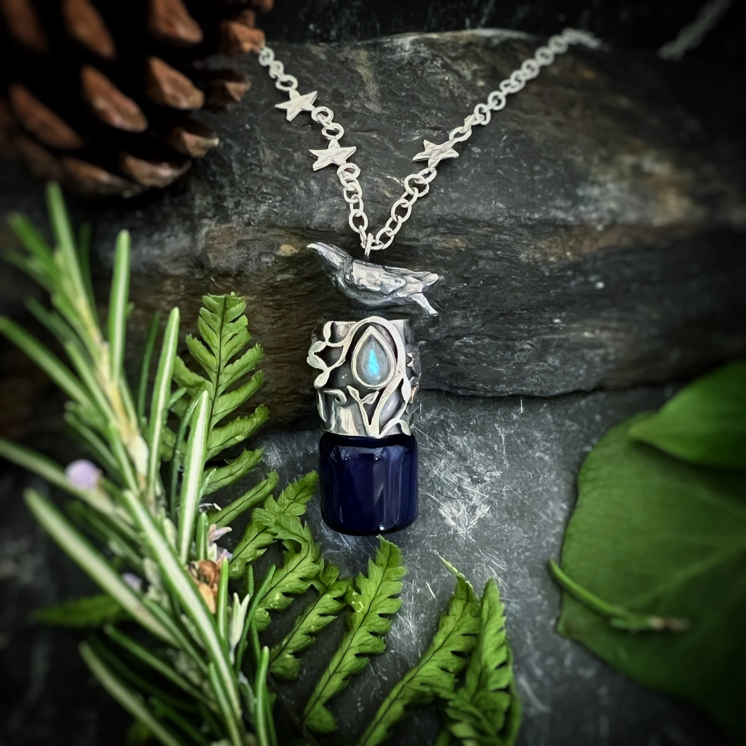 The lid is solid sterling silver with a blue flash labradorite and Edgar the Raven perched on top.